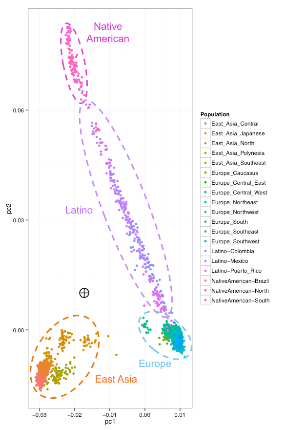 Below is an example plot for an individual who was determined to be 50% East Asian and 50% Latino. Latino ancestry is a mixture of European and Native American ancestry, so these groups are shown as well.