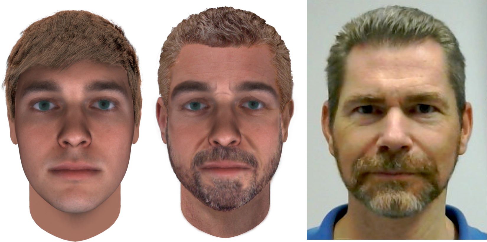 Composite (A) shown after age progression to 50 years old, including a beard (B) as compared to the actual subject (C)