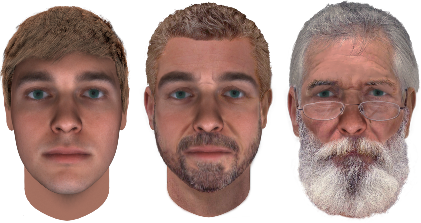 Examples of accessorization with Snapshot Forensic Art Services: the predicted composite at 25 years old (A); shown after age progression to age 50 years, with the addition of a light beard (B); and after further age progression to age 75 years with reading glasses and a full beard (C)
