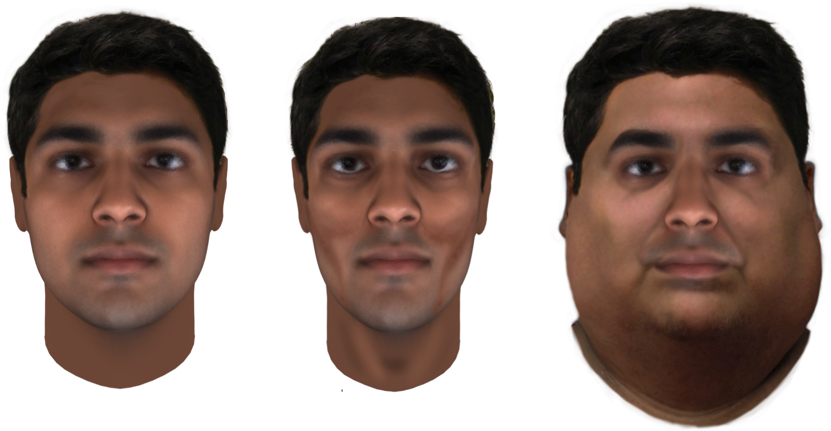 Extreme examples of body mass index (BMI) alteration: the original prediction (A); shown with significantly less body mass (B); and again with a significantly larger amount of body mass (C)