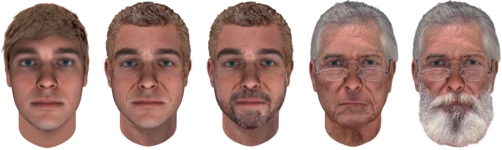 Examples of age progression and accessorization with Snapshot Forensic Art Services. By default, Snapshot produces composites from DNA at 25 years of age (A). Composite (A) shown after age progression to age 50 years (B); with the addition of a light beard (C); after further age progression to age 75 years with reading glasses (D); and with a full beard (E)