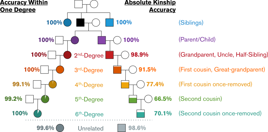 Built with advanced machine learning algorithms, the Snapshot kinship model can distinguish up to 9th-degree relatives (fourth cousins) from unrelated pairs.