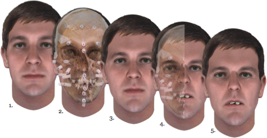 Stages of a Snapshot Facial Reconstruction: (1) a Snapshot composite produced from DNA extracted from the subject's bone; (2) Snapshot composite with skull overlay; (3) Snapshot composite after rescaling to conform to skull dimensions; (4) a cutaway image illustrating near final composite; and (5) final, blended Snapshot composite.