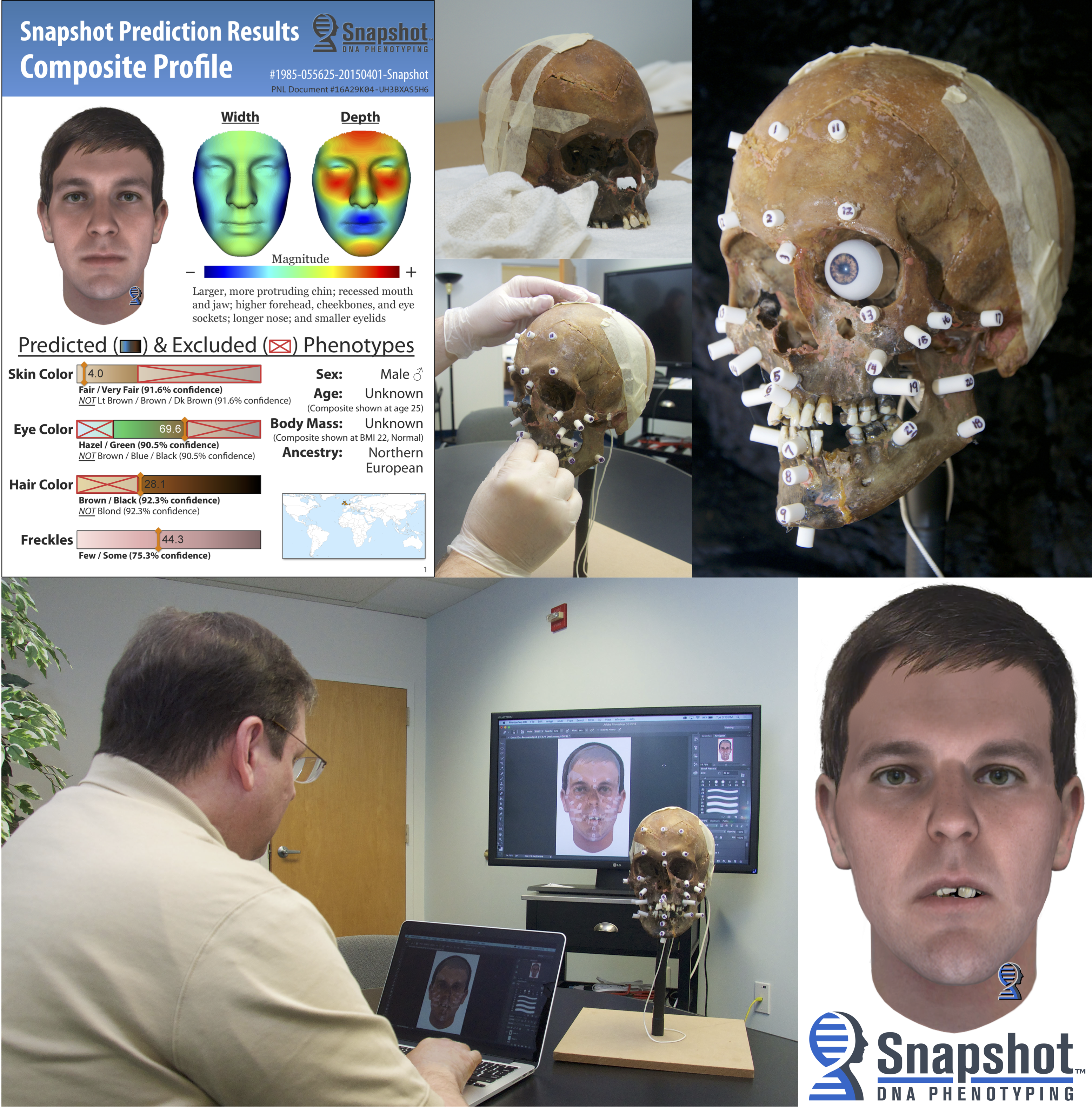 Snapshot phenotyping algorithms are used to predict a decedent's appearance and ancestry using DNA extracted from bone. Independently, a traditional facial reconstruction is performed by a forensic artist who has been specifically trained to interpret Snapshot DNA Phenotyping results. Tissue depth markers are physically applied to the decedent's skull, based on DNA-determined ancestry and estimated body weight, to produce a prediction of face shape from cranial morphology. A final composite is then produced by digitally blending the two predictions.