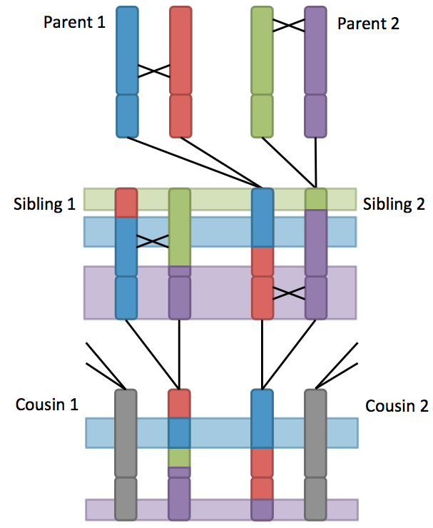 The standard atDNA metric used by genetic genealogists is the amount of DNA that two people are likely to have inherited from a recent common ancestor. This can be estimated by looking for long stretches of identical DNA. While alleles can easily be shared by chance at one or a few SNPs, it is highly unlikely for two unrelated people to share a long stretch of DNA. Therefore, only segments above a certain length are counted. The length of these shared segments is measured in centimorgans (cM), a measure of genetic distance, and the total number of cM shared across all chromosomes can be used to determine approximately how closely related two people are. The figure below shows how shared segments of DNA on a single chromosome are broken up with each generation, leading to shorter shared segments for more distant relatives. Using a public genetic genealogy database, DNA from an unknown person can be compared to roughly 1 million other people to see whether any of them are related.