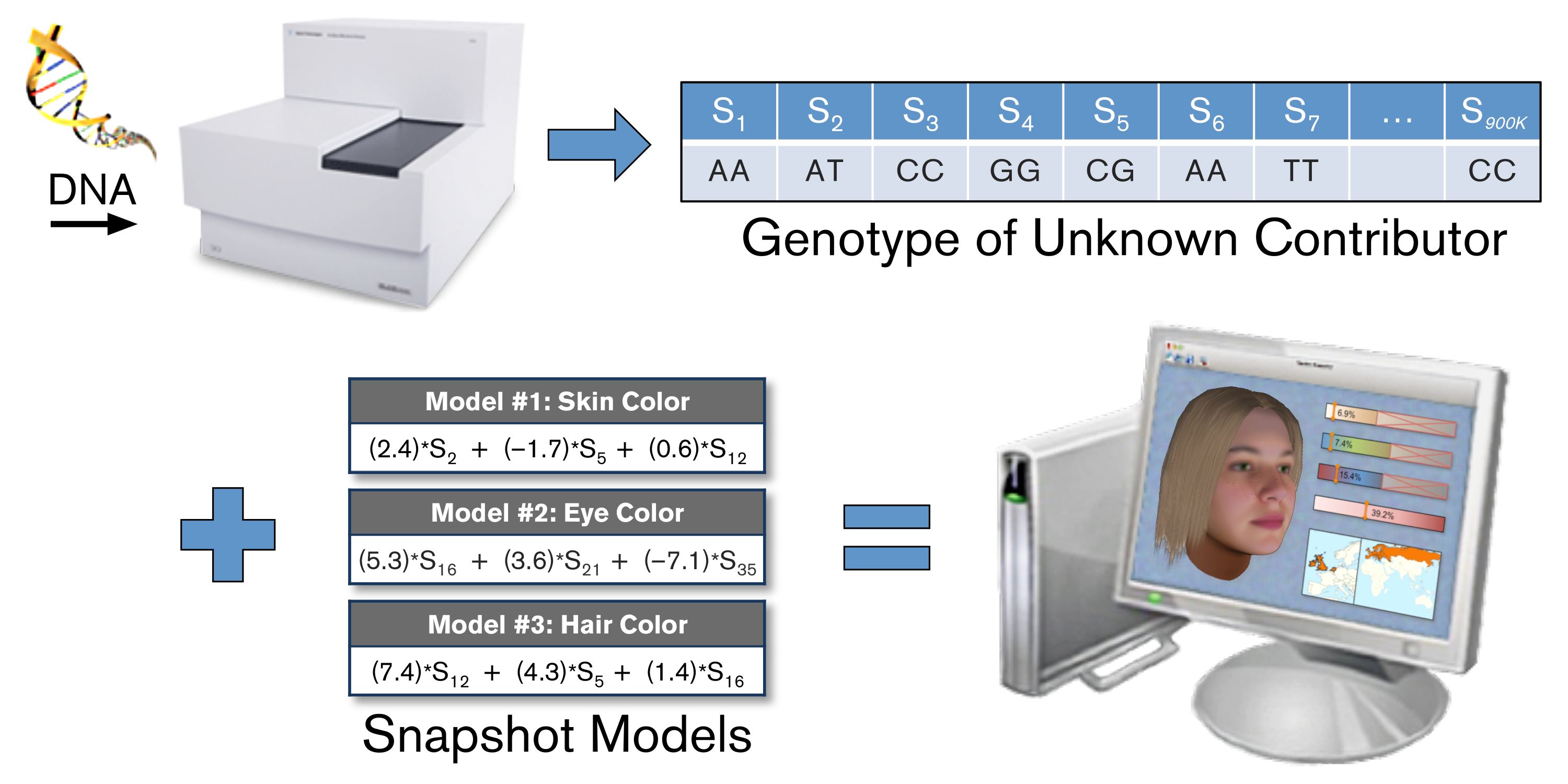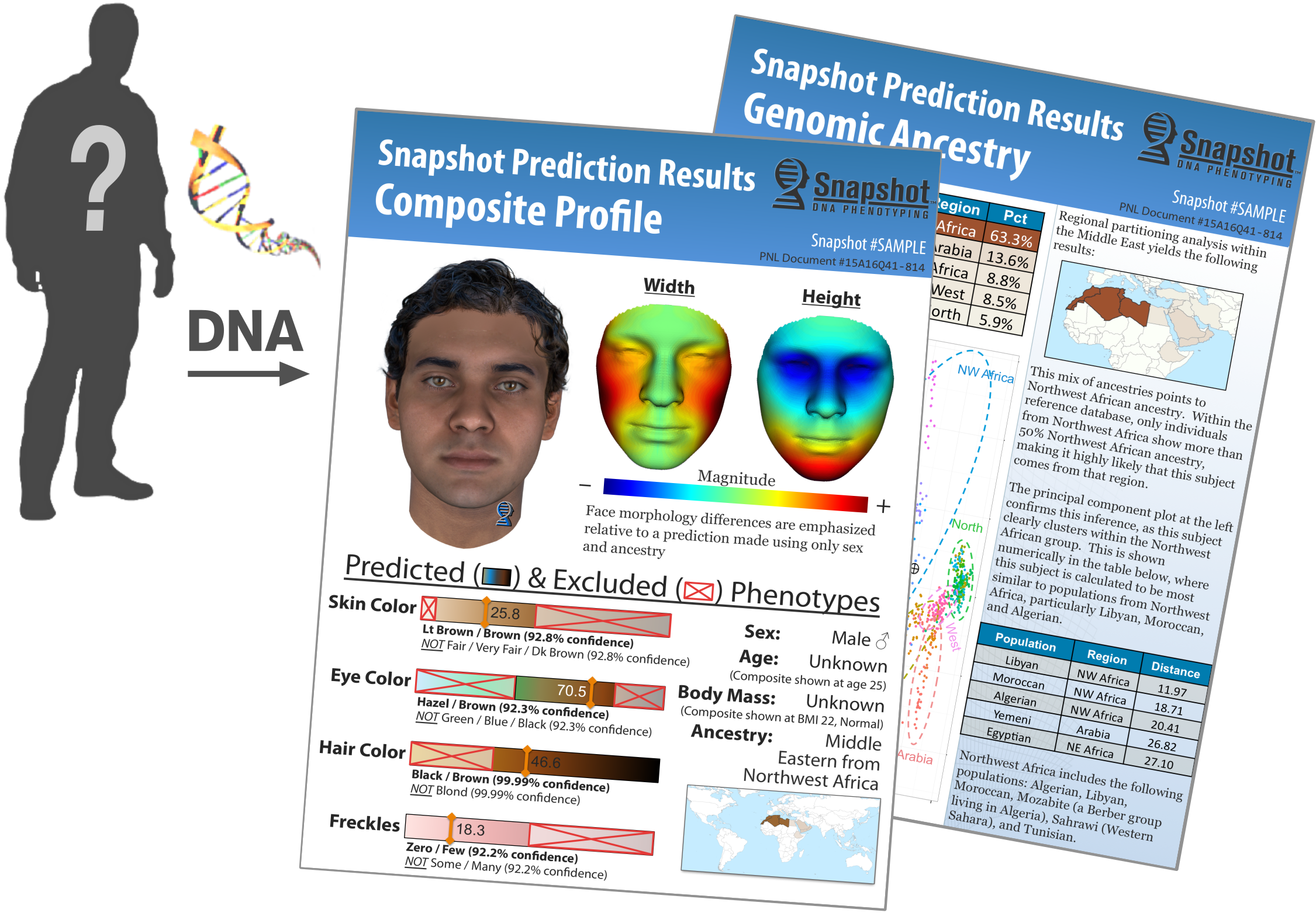 The Snapshot DNA Phenotyping System translates SNP information from an unknown individual's DNA sample into predictions of ancestry and physical appearance traits, such as skin color, hair color, eye color, freckling, and even face morphology. Each phenotype prediction is made with a measure of confidence, including those that can be excluded with high confidence.