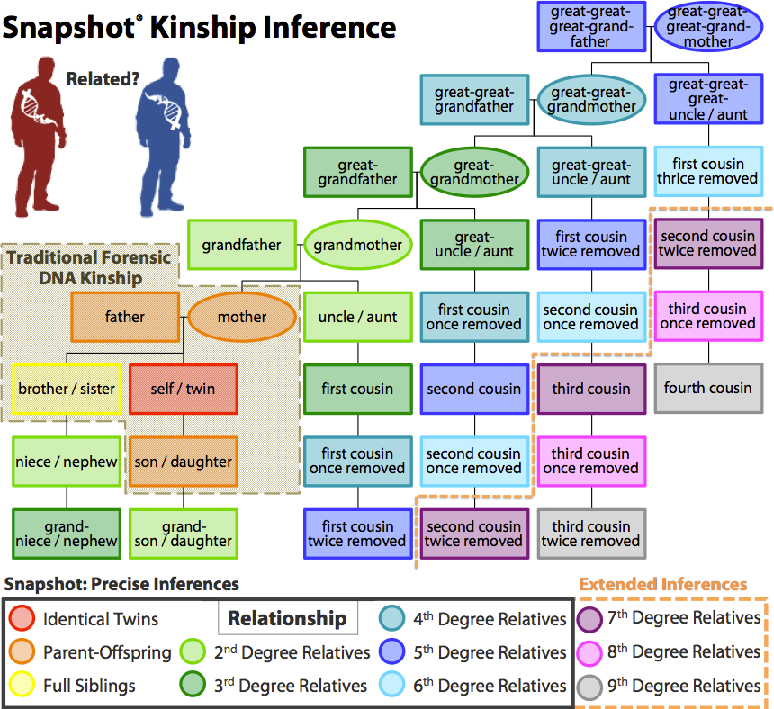 Snapshot Kinship Inference provides highly accurate inferences about the familial relationship between two people based on their DNA, even if they are distantly related. Unlike traditional forensic DNA methods, which are extremely limited in their ability to determine kinship (see tan region in the figure below), Snapshot can detect relatedness out to 9th-degree relatives (fourth cousins). This powerful forensic analysis tool gives investigators valuable, previously unobtainable information about the DNA samples found at a crime scene — information that can save time and money and lead to more solved cases.